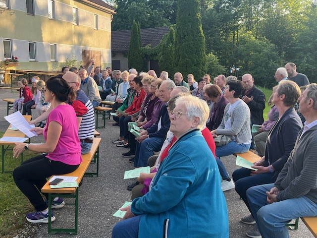 Anschließend wurde gemeinsam die Maiandacht gefeiert, die von Monika Langerreiter und Phillip Rodinger gestaltet und unter Beteiligung der Familie Kloibhofer abgehalten wurde. Aufgrund des einsetzenden starken Regens wurde die Maiandacht vom Bildstock in das Carport der Familie Kloibhofer verlegt, wo rasch einige Heurigengarnituren zum Sitzen aufgebaut waren und die Andacht gut zu Ende gebracht werden konnte. Im Anschluss lud Familie Kloibhofer zu einer Agape ein. Im Carport wurden Brot, Bier und Wein gereicht und der Starkregen lud noch durchaus zum Verweilen im geschützten Unterstellplatz ein, wo schlussendlich noch schöne Gespräche und ein gemütliches Beisammensein die Andacht abrundeten.