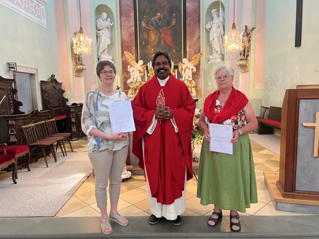 Herzliche Gratulation an Cordula Ebner und Veronika Nagelhofer für die erfolgreiche Absolvierung ihres Kommunionspenderkurses. Die Urkunden wurden am Oeder Kirchweihfest von Pfarrer Shiju Augustine überreicht.