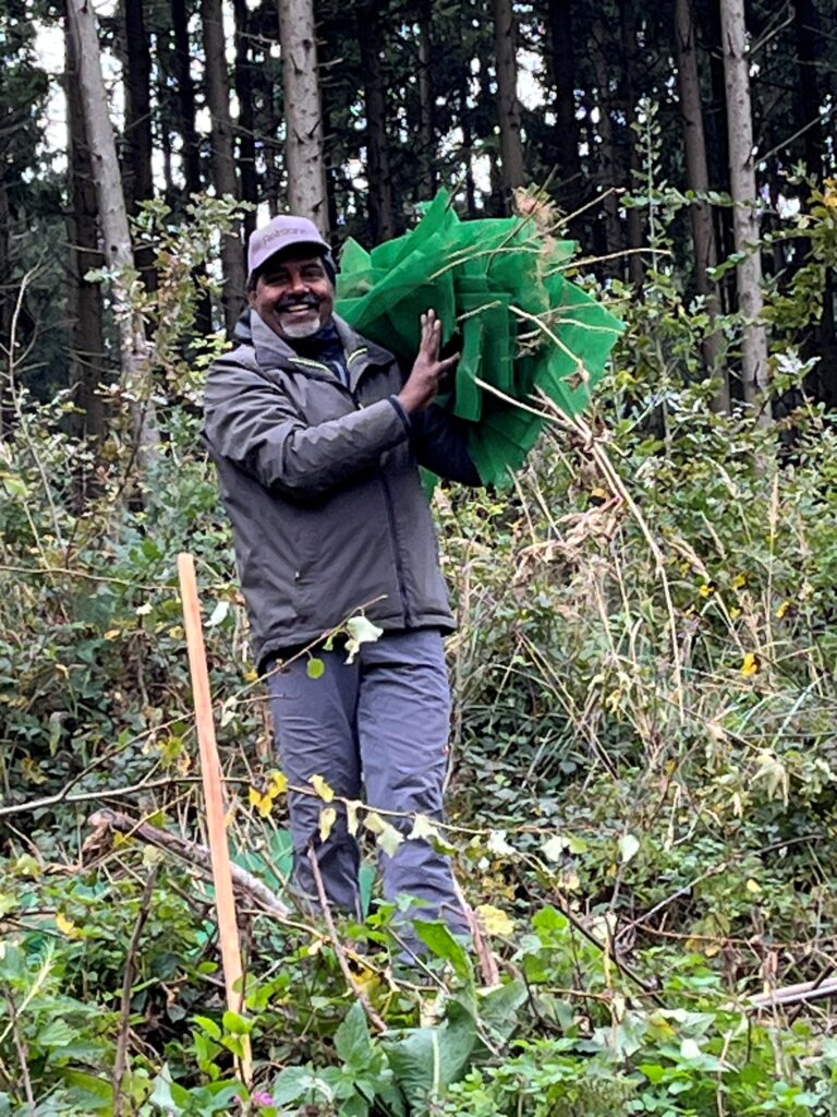 Mitte Oktober erfolgte – wie im letzten Pfarrblatt angekündigt – die Aufforstung im Pfarrwald Oed. 430 Bergahorn, 200 Lärchen und 80 Hainbuchen warteten darauf ausgepflanzt zu werden. Dankenswerterweise meldeten sich viele freiwillige Helfer: Hans Affengruber, Martin Ebner, Josef Fuchs, Thomas Fuchs, Hubert Gruber, Hubert Hehenberger, Erwin Lienbacher, Alois Rosenberger, Stefan Schörghuber, Anton Spreitz und Pfarrwaldbetreuer Leopold Wagner. Auch Pfarrer Shiju Augustine ließ es sich nicht nehmen und packte fleißig mit an (siehe Foto). Für das leckere Mittagessen im grünen Wald sorgten Andrea Dorn und Karin Lienbacher.